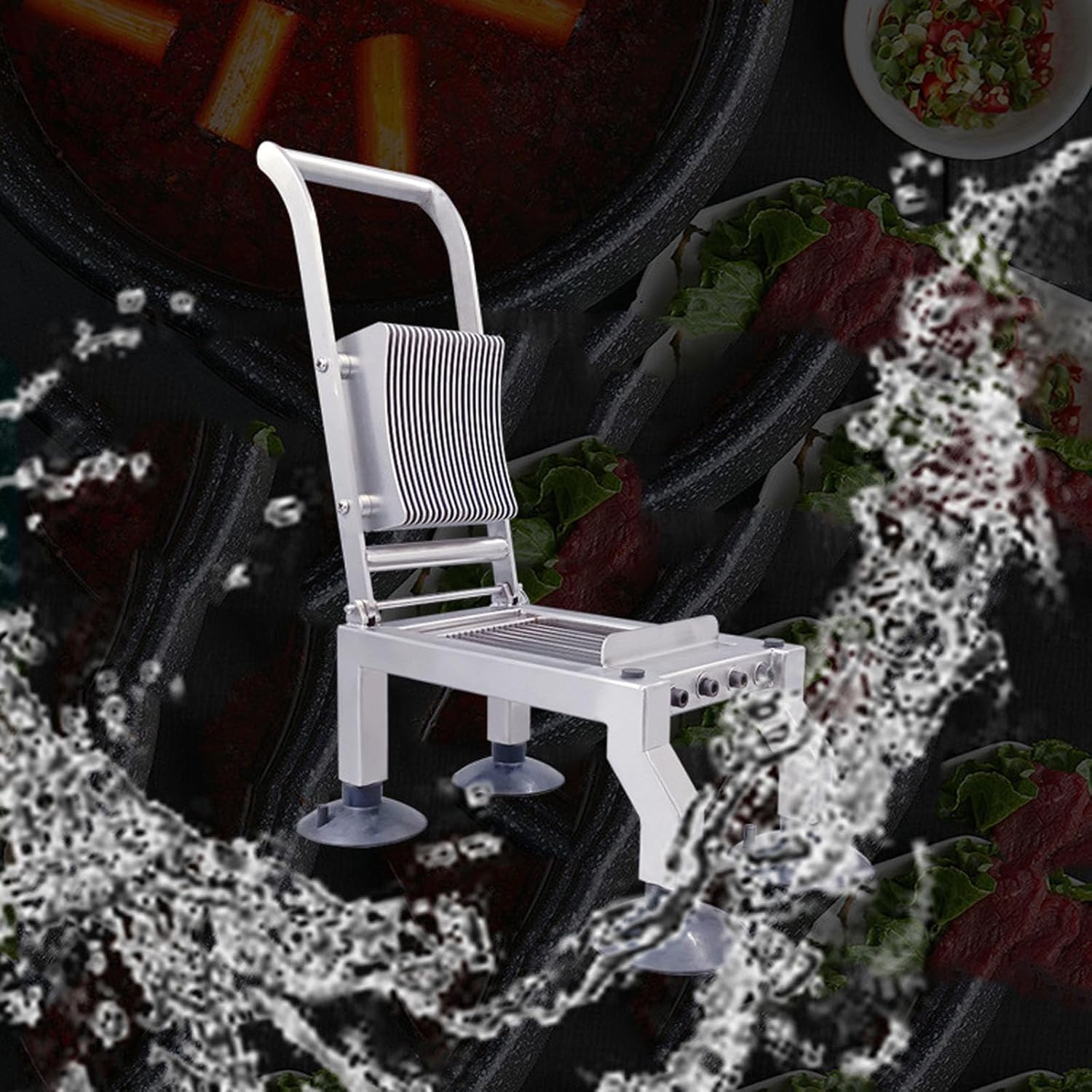Feature:1. Stainless Steel Material: The commercial vegetable cutter is made of premium stainless steel, which is sturdy and rust resistance, long service life.2. Versatile and Even Cutting: The machine is suitable for various fruits and vegetables, including onions, potatoes, tomatoes, lemon and kiwi, cut into uniform pieces.3. Stable and Anti Slip: Four anti slip rubber suction cup feet reduce vibrations and securely hold the cutter in place, ensuring a stable cutting process.4. Easy Maintenance: Designed with a comfortable and user friendly long arm handle for easy operation. The machine can be directly washed with water, making cleaning convenient.5. Wide Applicability: This commercial vegetable cutter is suitable for restaurants, hot pot shops, canteens, buffet restaurants, chain catering enterprises, and more.Specification:Item Type: Commercial Vegetable CutterMaterial: Stainless Steel, RubberColor: SliverSize: 33.3x18.5x16.6cm/ 13.1x7.3x6.5inWeight: 4kg/ 8.8bPackage List:1 x Vegetable Cutter1 x Brush4 x Suction cup4 x NutNOTE: This veggie slicer is good for tomato, cucumber, and other soft vegetables. It’s not good for super hard vegetables. Avoid using acid-containing cleaning agents, as they can damage the surface coating of the slicer and cause the machine body to turn black.