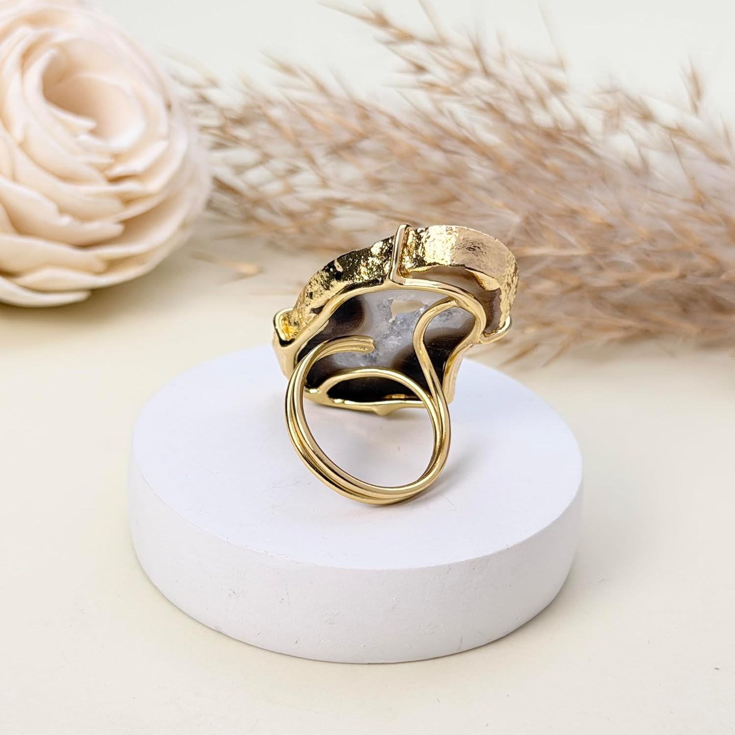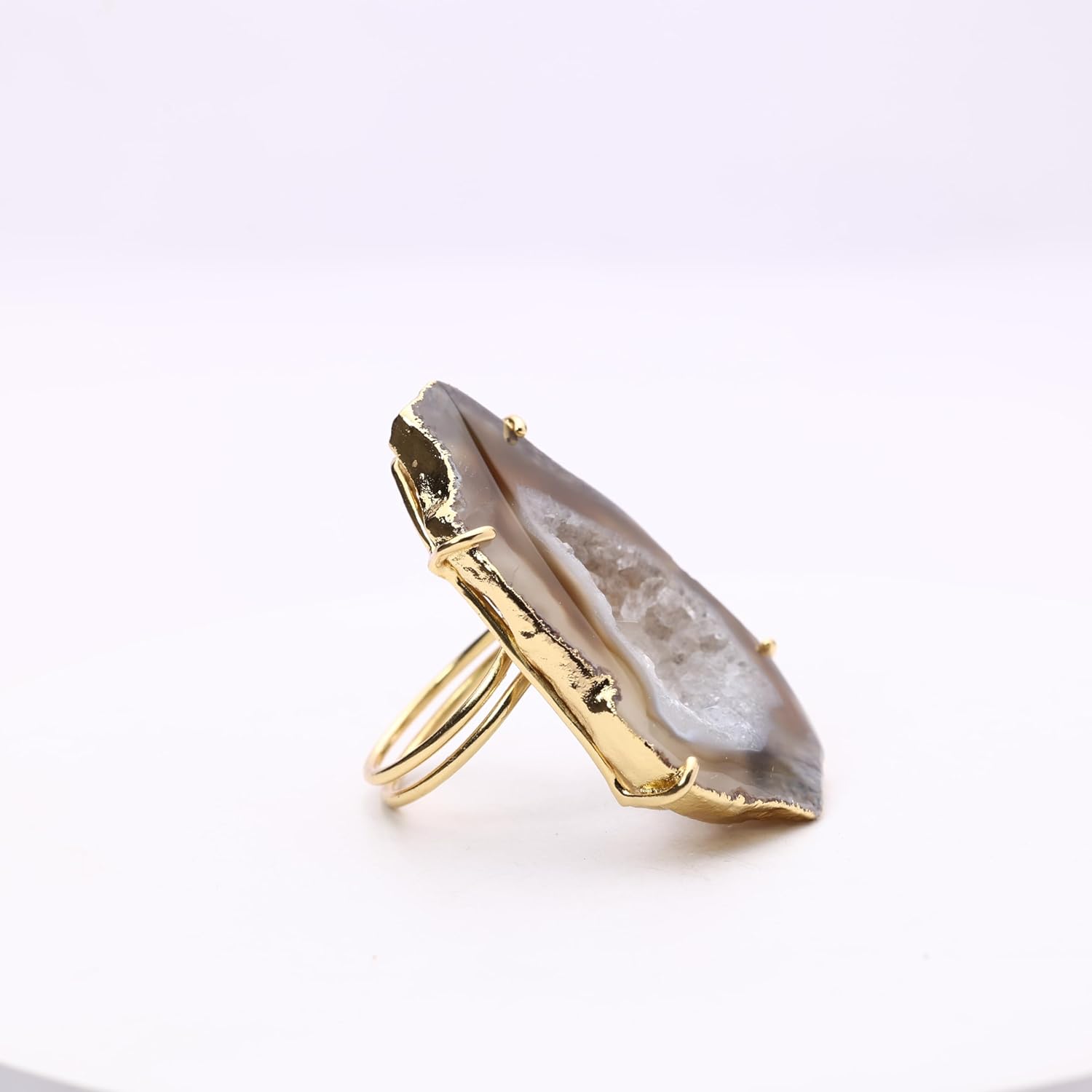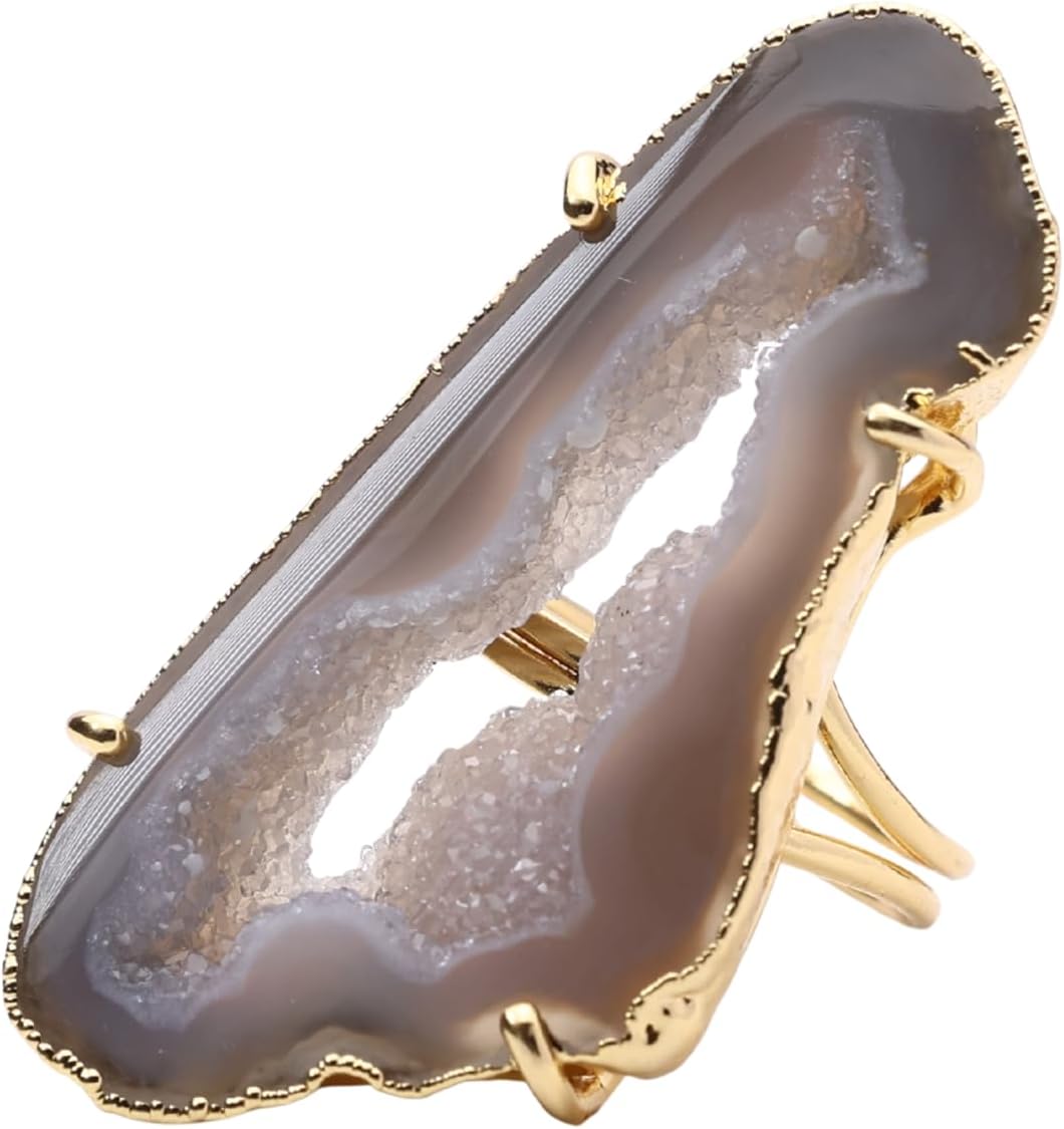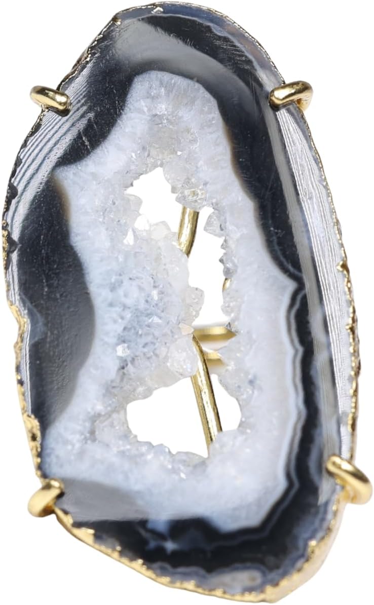 These eye-catching geode slice rings boast natural beauty and shine. Crafted from genuine druzy quartz embedded with flecks of gold. The adjustable band expands from size 6 to 8 for a comfortable and versatile fit. Display your appreciation for the earth's wonders every time you wear this one-of-a-kind jewelry.
