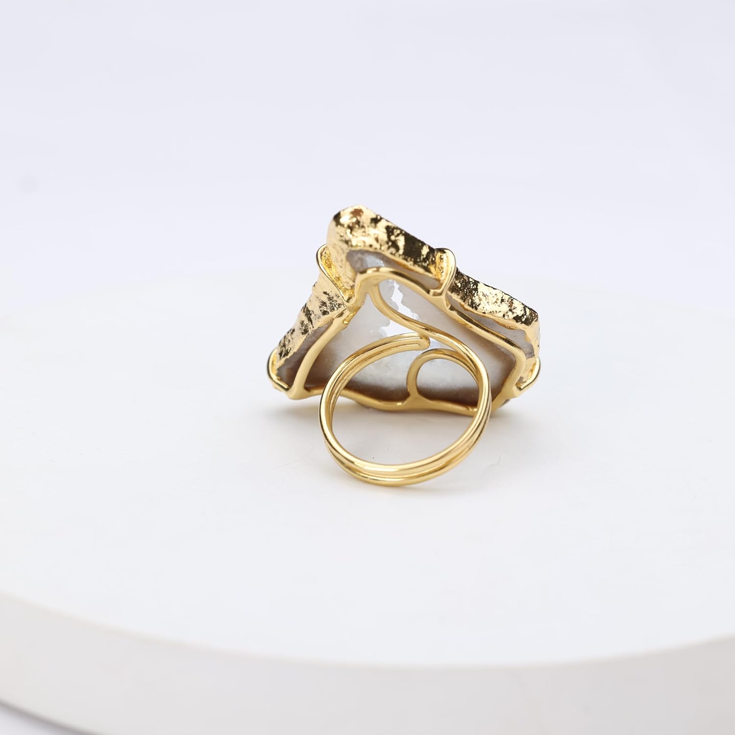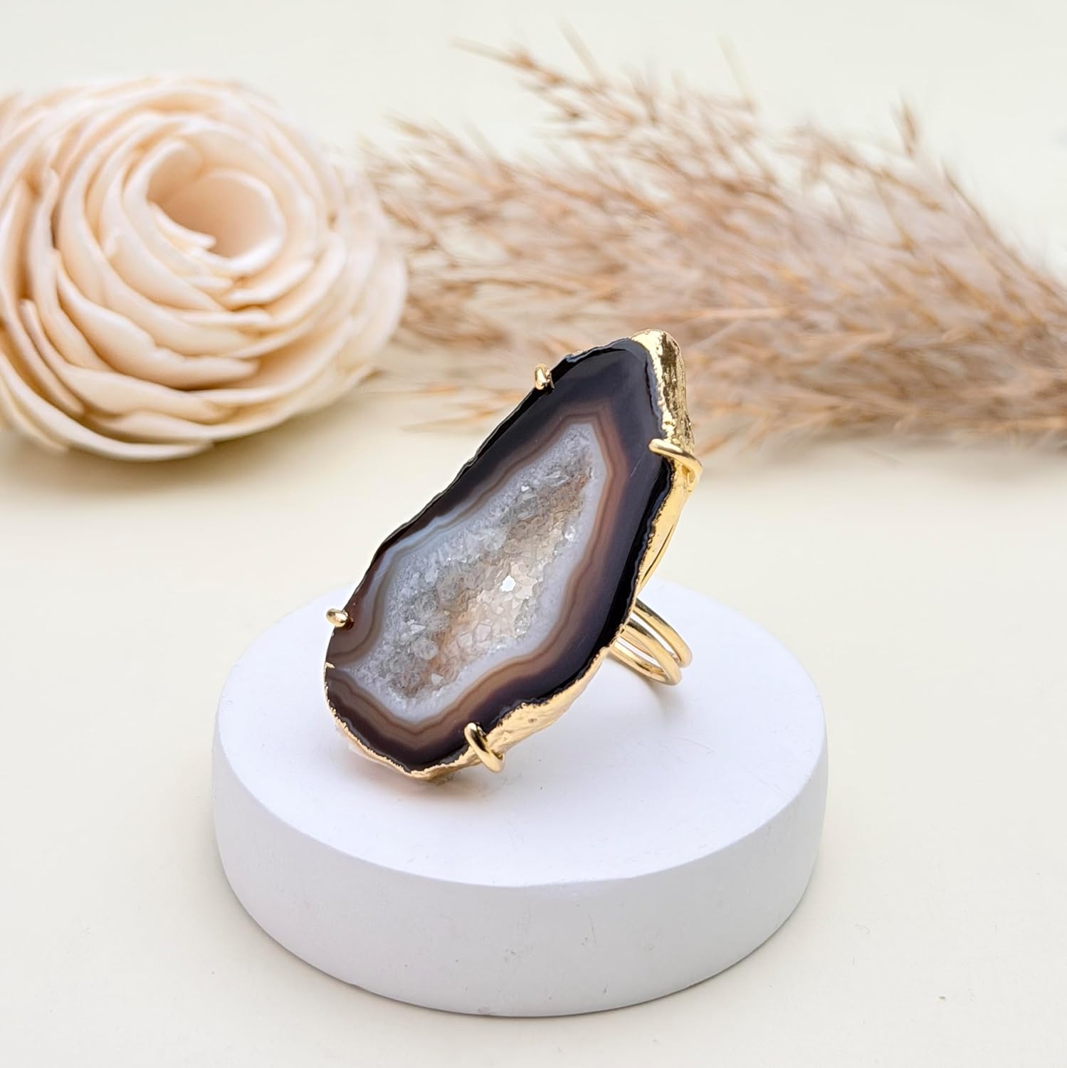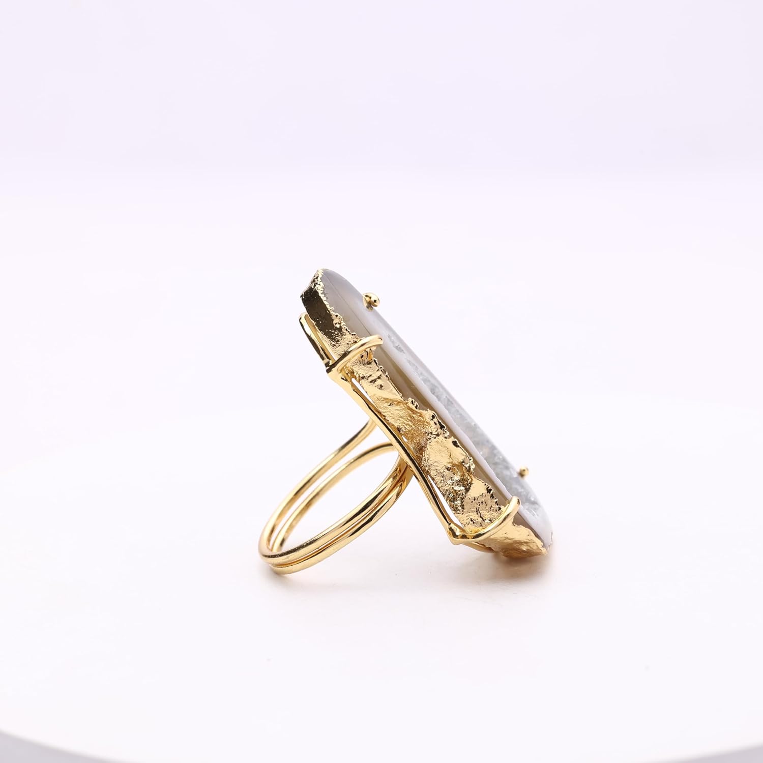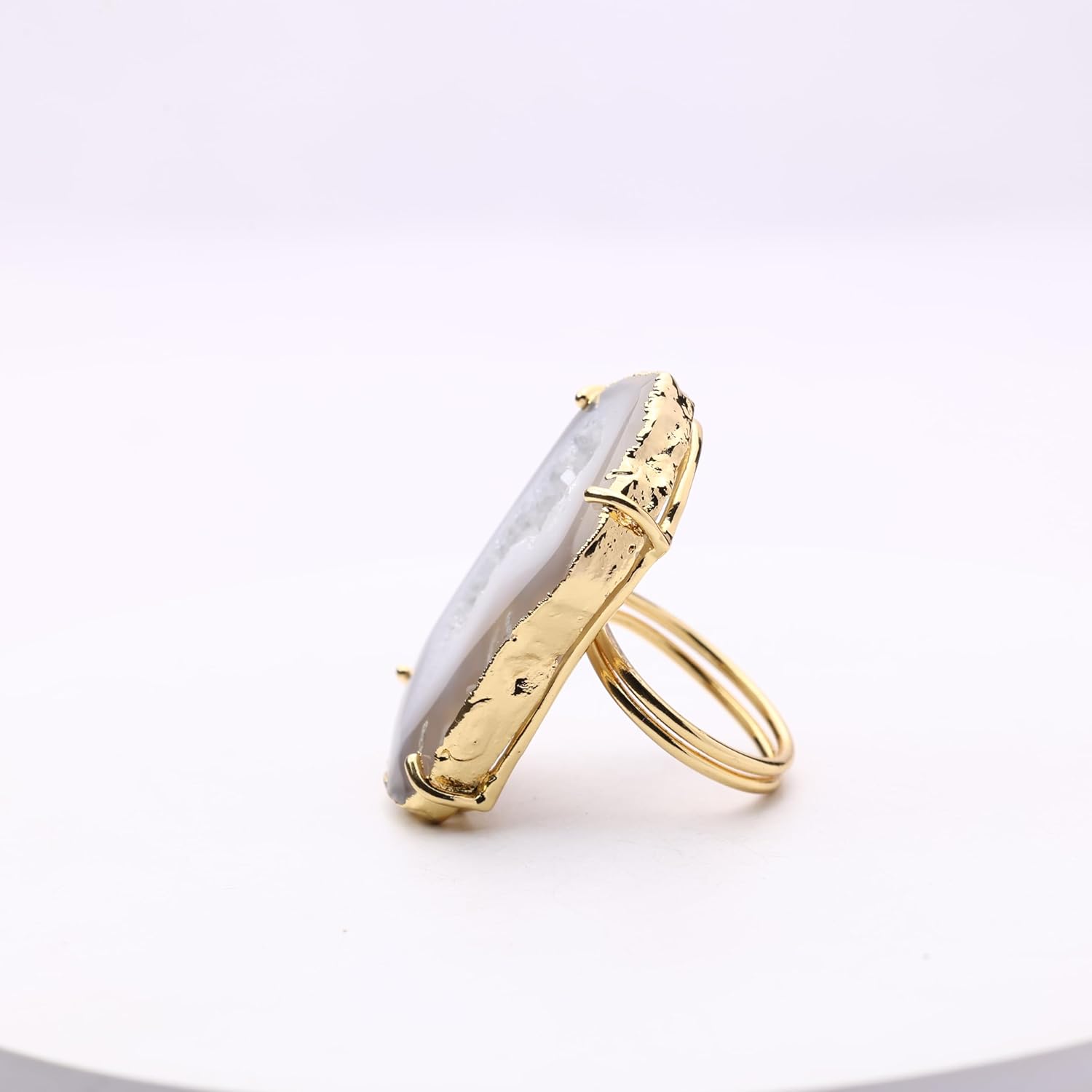These eye-catching geode slice rings boast natural beauty and shine. Crafted from genuine druzy quartz embedded with flecks of gold. The adjustable band expands from size 6 to 8 for a comfortable and versatile fit. Display your appreciation for the earth's wonders every time you wear this one-of-a-kind jewelry.