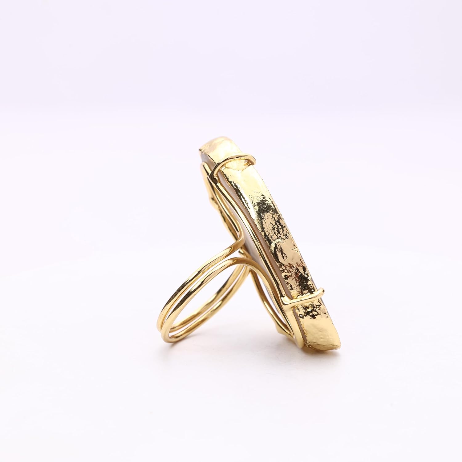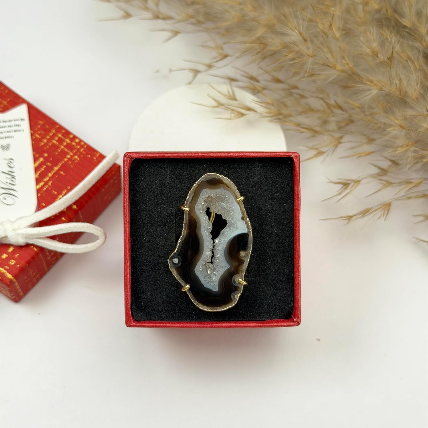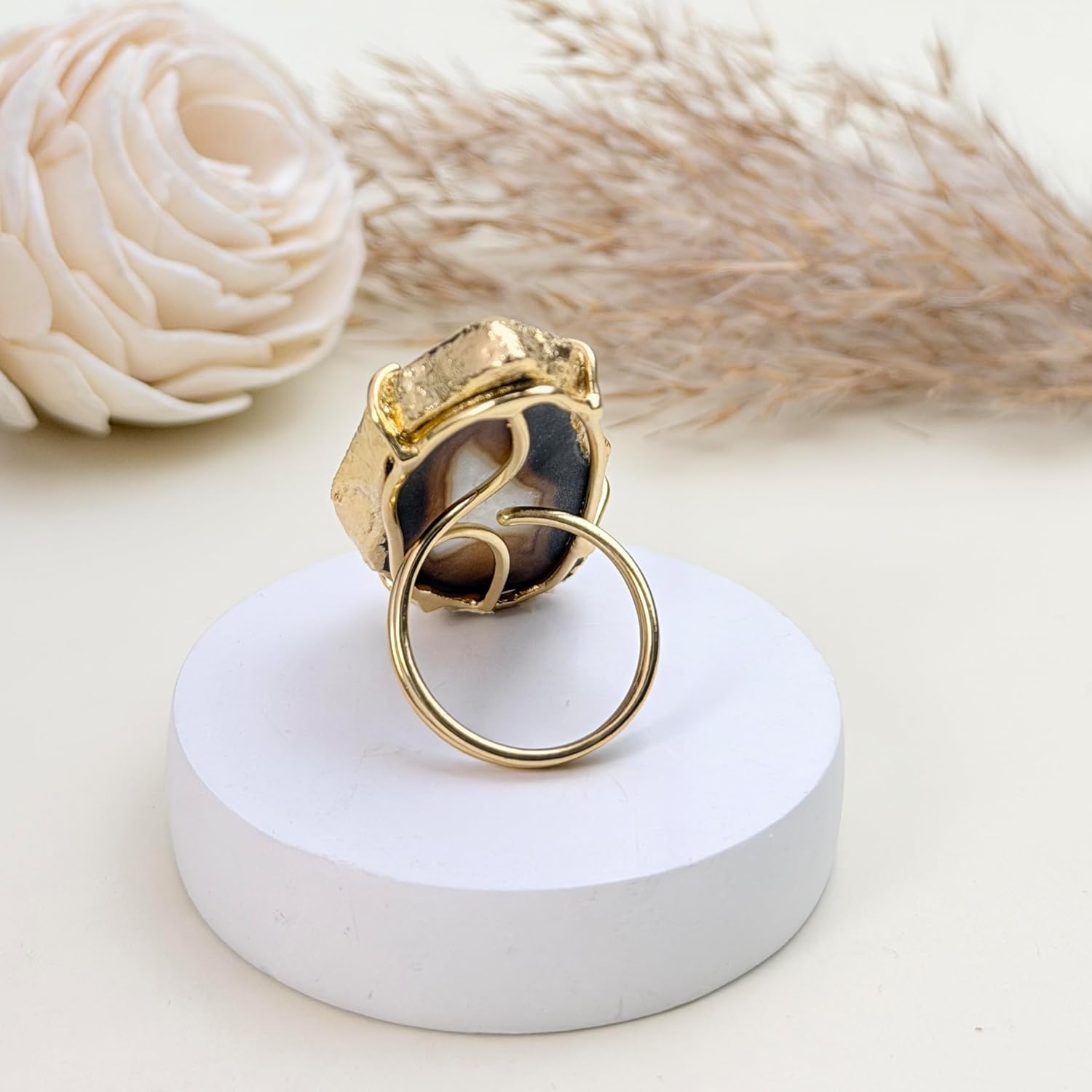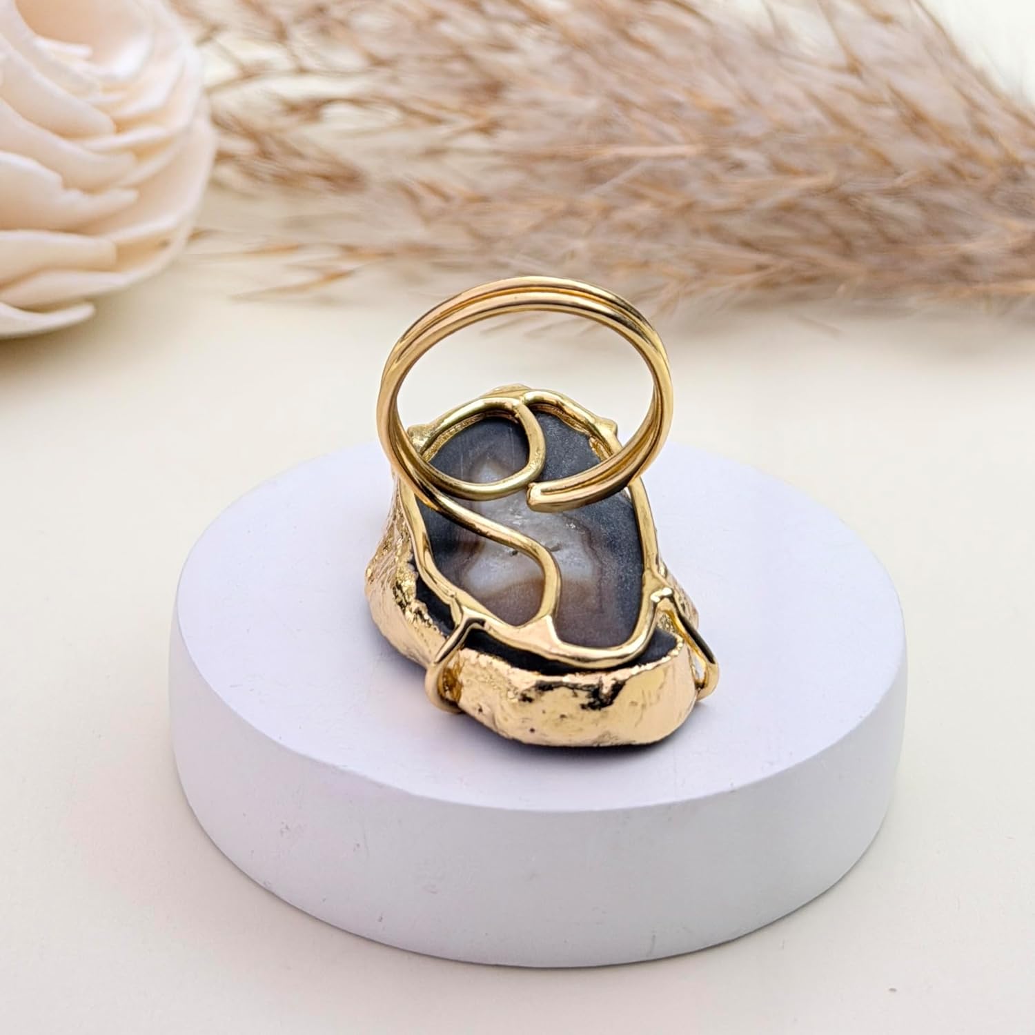 These eye-catching geode slice rings boast natural beauty and shine. Crafted from genuine druzy quartz embedded with flecks of gold. The adjustable band expands from size 6 to 8 for a comfortable and versatile fit. Display your appreciation for the earth's wonders every time you wear this one-of-a-kind jewelry.