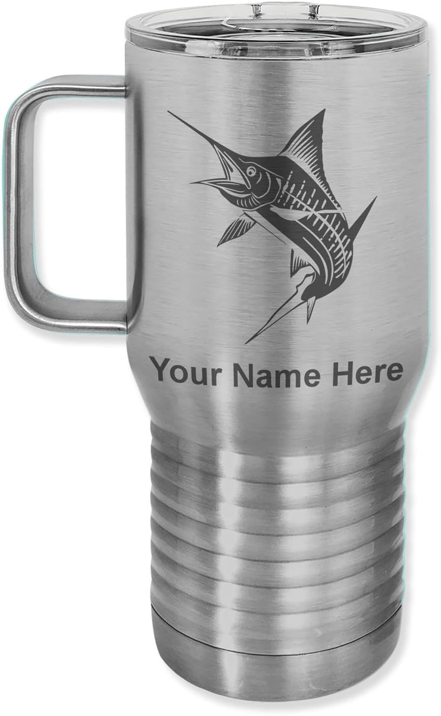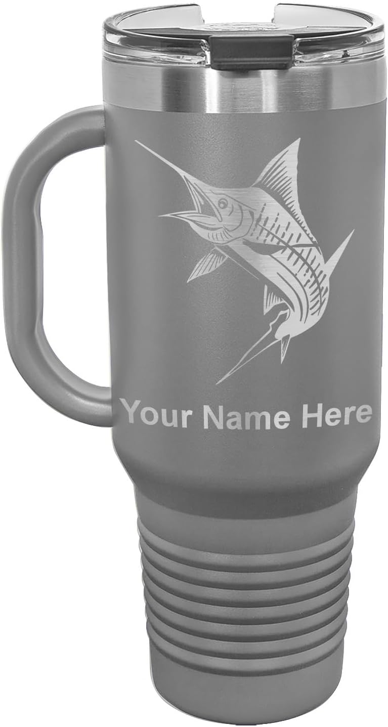 LaserGram 40 ounce Travel Mug with Handle that is laser engraved with the image that you see in the photo. Your own personalized text will be laser engraved below the image. Features double-walled stainless steel vacuum insulation with a clear lid. Click the "Customize Now" button to begin customizing your mug.