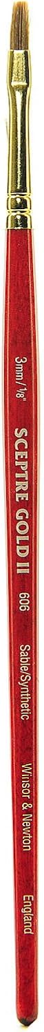 Winsor & Newton scepter gold II brushes are the perfect mix of Sable and synthetic giving the performance of a Sable at the price of synthetic. Artists generally recognize that pure Sable brushes are the best, but costly, so consideration of price may compel many to use a synthetic brush instead. However, while today's synthetic brushes perform better than ever, pure Sable still has the edge. This is why Winsor & Newton offers scepter gold II, a brush that's made from a blend of pure Sable and synthetic fibers, giving you a performance that is close to Sable at a price that is close to synthetic. The blend of hair in scepter gold II also gives you added benefits. Sable hair has excellent spring while the high quality synthetic filaments ensure that the brushes are soft enough to work the color but also have a strong snap so they return back to their original shape with ease. The high proportion of Sable in scepter gold II gives the brushes considerably more ability to make larger washes in one stroke than normal synthetic brushes and the hairs are tapered to a fine point, giving the brush control for detailed work. Scepter gold II brushes are ideal for working with watercolor and fluid oil color but are also suitable for use with acrylic, water mixable oil and alkyd Fast drying oil color. Each scepter gold II brush has a copper-colored handle and a seamless, gold-colored ferrule.